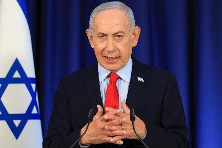 19日、エルサレムで記者会見するイスラエルのネタニヤフ首相。対イラン軍事作戦で「われわれは勝利しつつあり、イランは壊滅的打撃を受けている」と述べた。 【AFP時事】